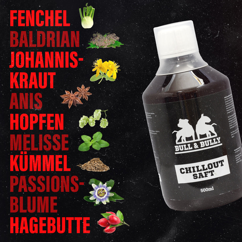 Der Chillout Saft enthält eine 100% natürliche Kräutermischung, um deinem Hund in stressigen Situationen schonend zu beruhigen. Die mit Tierärzten entwickelte Rezeptur enthält die bewährtesten Alternativen wie Baldrian, Johanniskraut und Passionsblume, damit sich dein Vierbeiner schneller entspannen kann. Die pflanzliche Formel wirkt dabei besonders schonend, ganz ohne deinen Hund schläfrig oder lethargisch zu machen. Im Optimalfall bitte 14 Tage vor der Stresssituation mit der Fütterung beginnen.